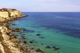 Через 50 км мы свернем с асфальта и проедем 13 км по степной дороге к панораме на впадину Каракия в местности Саутты. Остановка для фотографирования. Здесь у основания скального обрыва находится радоновая термальная скважина. Спуск не сложный по горной тропе, займет 10 - 15 минут. Здесь можно искупаться. Скважина не обустроена.