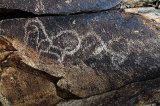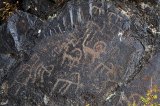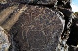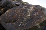 Fifteen argali are depicted on the plates around a symbolic image resembling a spreading acacia, similar to the one growing near the rocky exit in this gorge at the present time. Anthropomorphic characters are represented by horsemen on horseback and in one case on a two-humped camel.