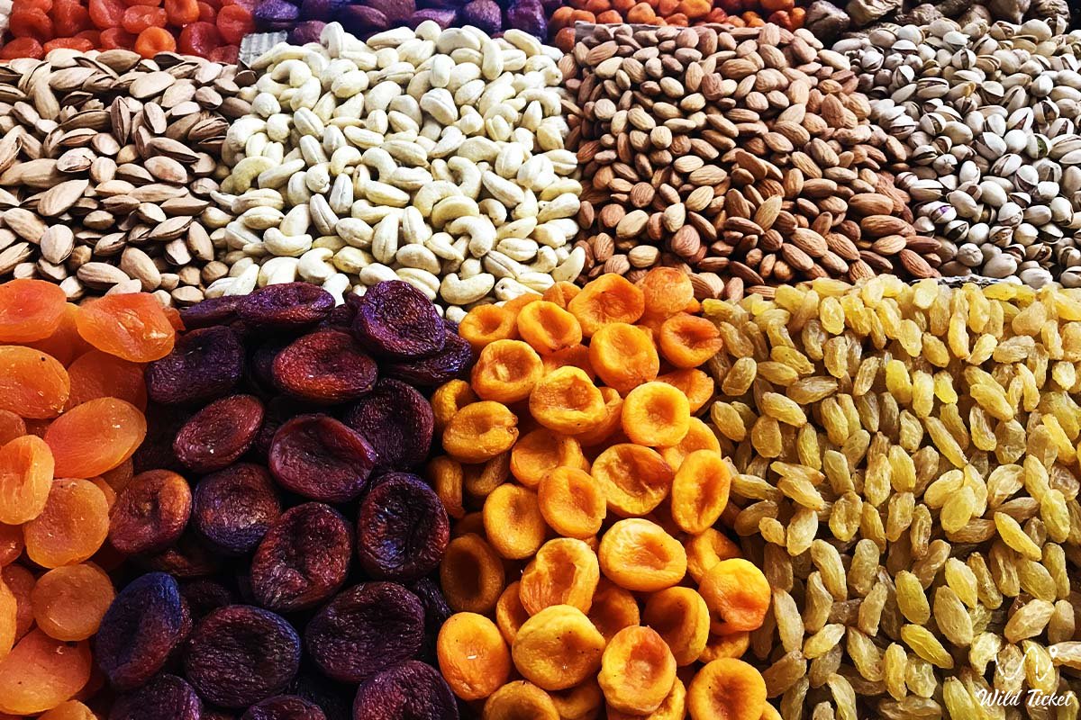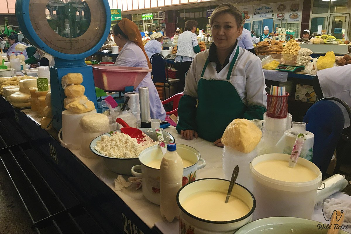 The shops with nuts and dried fruits seem to be a separate universe: dried apricots, dates, figs, raisins, pistachios, cashews – the sellers willingly give you a taste, tell you where the goods came from, and advise you what is better to take on the road or as a gift. Nearby you can buy honey, homemade cheese, kymyz and shubat, as well as traditional Kazakh products familiar to both locals and those who are just discovering the cuisine of the region.