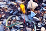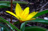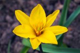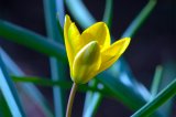 The Single–Flowered Tulip (Tulipa uniflora) is a miniature but surprisingly beautiful plant that attracts attention with its modest sophistication. Its bulb is ovoid in shape, up to 2 cm in diameter, and is covered with thin, almost papery, black-brown scales, which are densely pubescent with pressed hairs on the inside. The stem of the plant is low, reaching only 10-15 cm. The leaves are narrow, linear-lanceolate, close to each other at a distance of 0.5–1.5 cm, which gives the plant a compact and neat appearance. The flower is single, slightly drooping in the bud, up to 3 cm high. The leaves of the perianth have a rounded tip and are colored bright yellow, while the outer petals are decorated with a dull purple or bluish-green stripe on the outside, which adds a special sophistication to the flower. The staminate filaments and anthers are yellow, and the ovary has a very long column. The fruit is an ovoid-cylindrical capsule, the length of which, together with the spout, reaches 4-5 cm with a width of no more than 1 cm. The box can contain up to 103 normally developed seeds. The plant reproduces both by seeds and vegetatively. The flowering period falls at the end of April – May, and fruiting occurs in June – July.