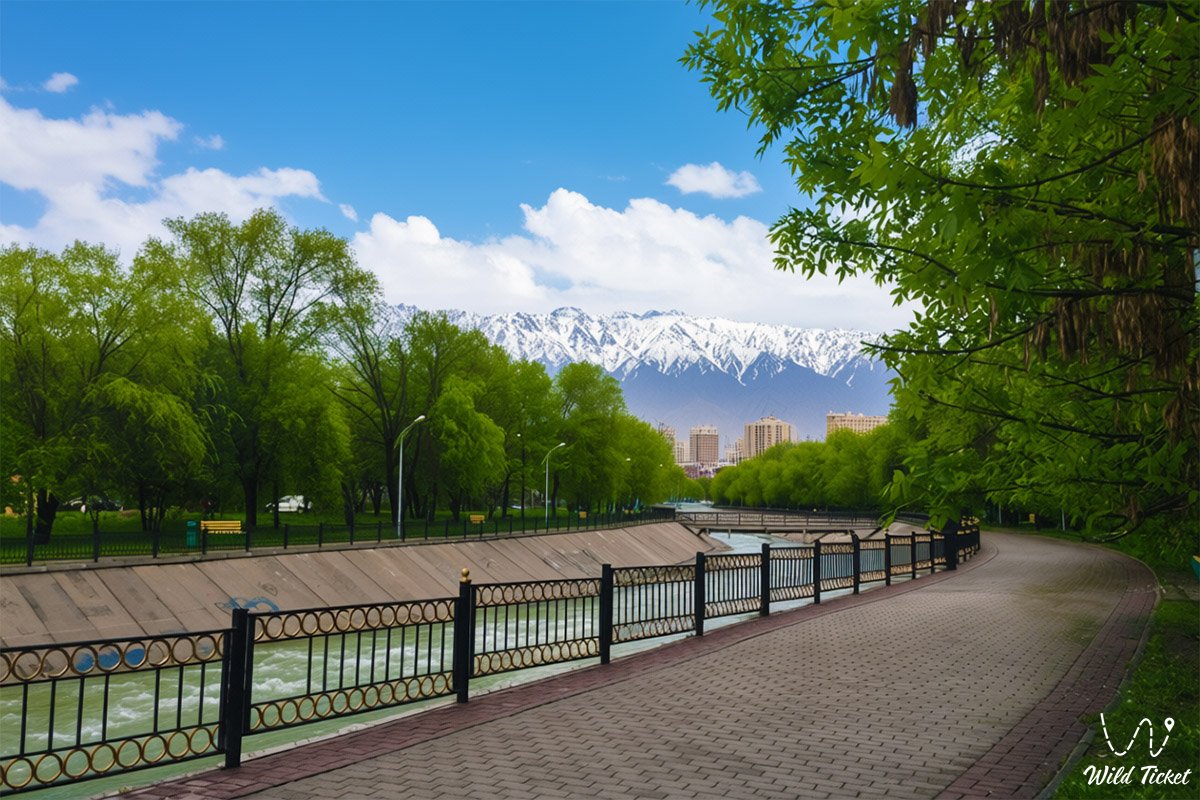 The Khamit Yergaliyev Embankment is a modern, well-maintained pedestrian area stretching along the Esentai River (formerly the Vesnovka River), located in the eastern part of Almaty. The embankment was named after the famous Kazakhstani poet Khamit Yergaliyev. The pedestrian route along the river extends almost the entire length of the river, starting from Alfarabi Avenue, through Satpayev Street and Temiryazev Street, and ending in the lower (northern) part of the city. From the embankment, you can clearly see the mountains of Almaty and the peaks of the Trans-Ili Alatau.