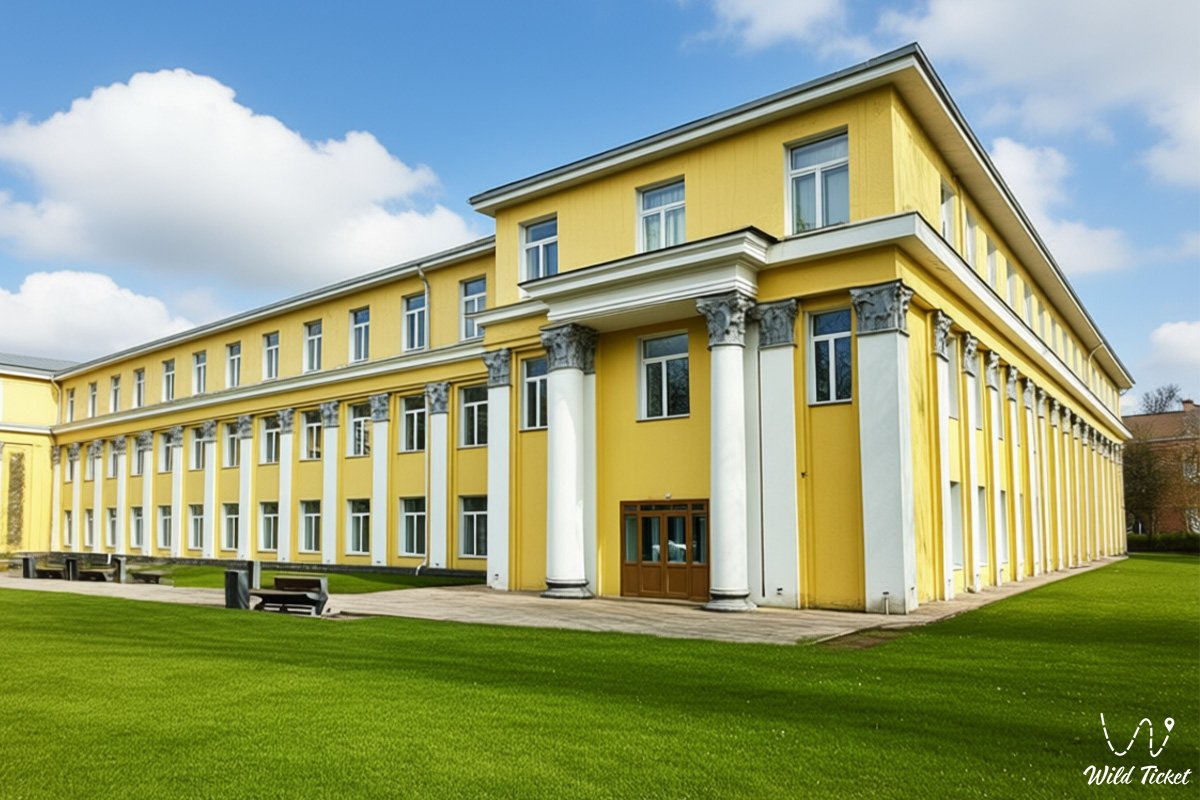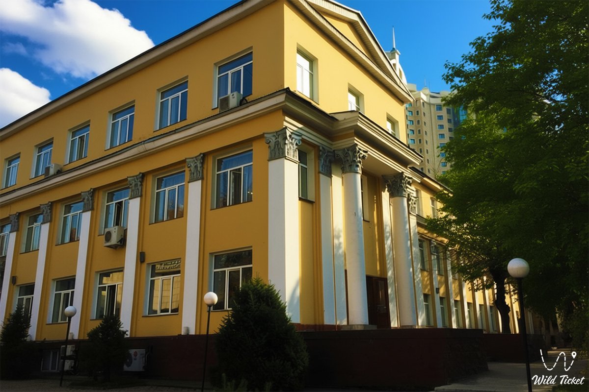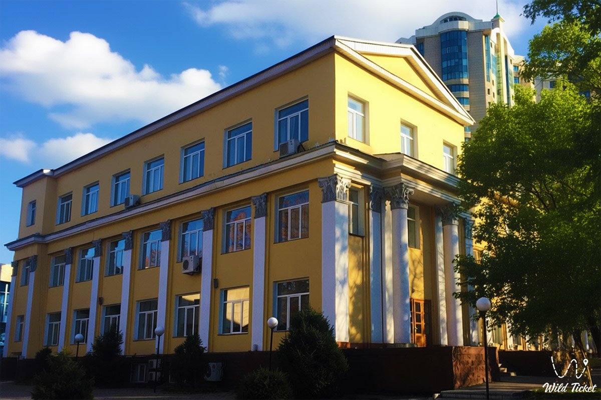The conservatory building is located in the historical center of Almaty and is an architectural ensemble that has developed over several decades. The main building, built during the Soviet period, is designed in the Stalinist neoclassical style with elements of local flavor: strict proportions, colonnades, and a solemn facade, which emphasizes the importance of the institution as a cultural center of the republic.