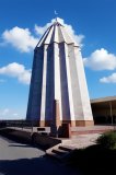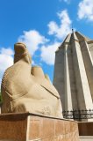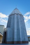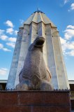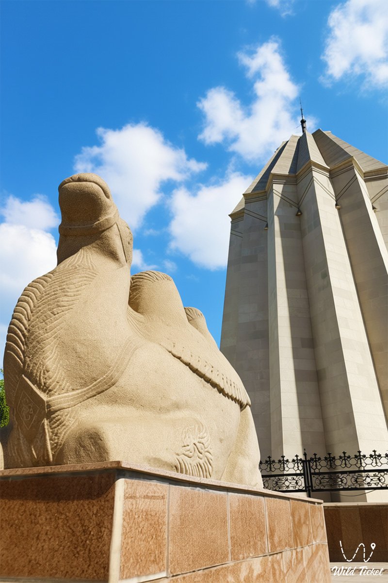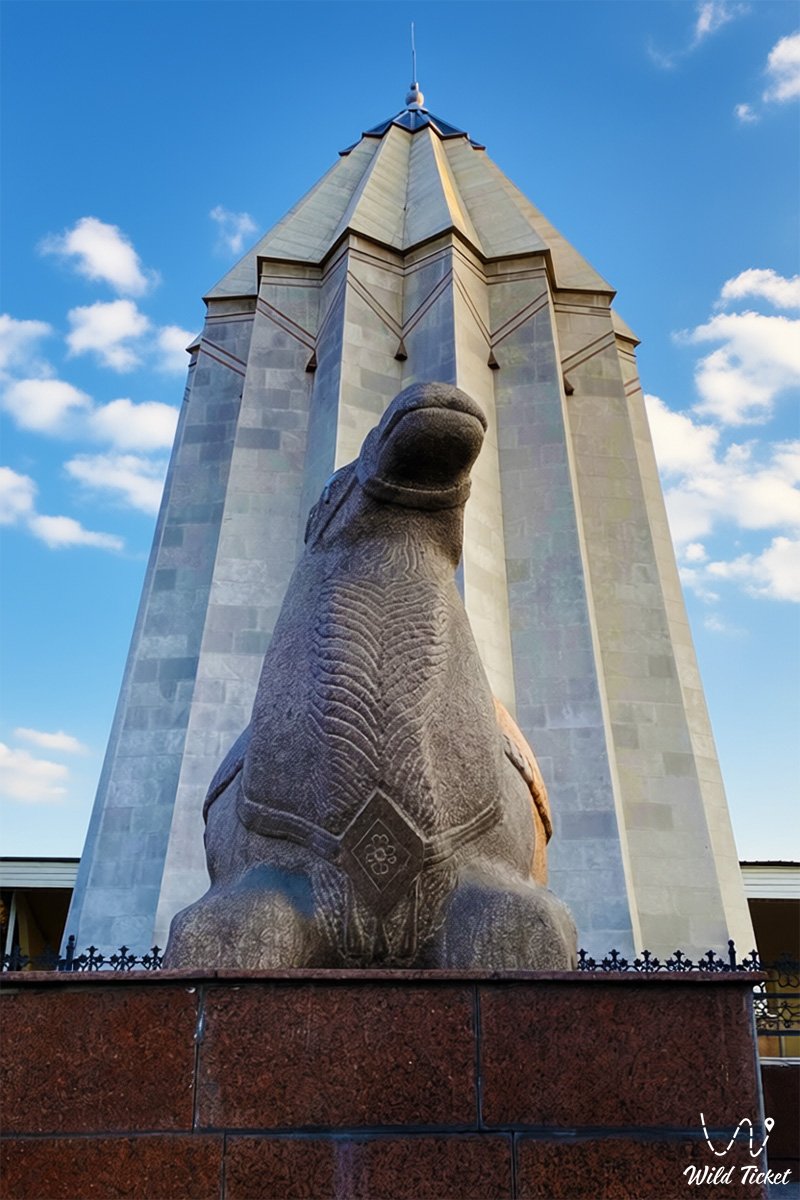 The Raiymbek Batyr Mausoleum was erected in 1994 on Raiymbek Avenue in the northern part of Almaty. The project's authors are B. Ibrayev, Sh. Otepbayev, and S. Agytayev; architect Bek Anuarbekovich Ibrayev. The structure's architecture is distinguished by its simplicity and nobility. The light-colored stone of which the mausoleum is constructed reflects the sun's rays, creating a feeling of warmth and purity. The building's multifaceted shape, reaching upward, symbolizes eternity, fortitude, and the elevation of the soul. A crescent moon crowns the mausoleum's summit. A sense of tranquility and reverence reigns within. Plaques with brief information about the hero's life and exploits, as well as prayer spaces, are installed here. A statue of a reclining camel stands in front of the mausoleum.