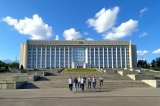 The facade of the building is decorated with bas-reliefs and decorative elements, emphasizing the formality and importance of the institution. In front of the building there is a wide square with flagpoles, flower beds and evergreen fir trees, and behind there are landscaped squares and alleys.