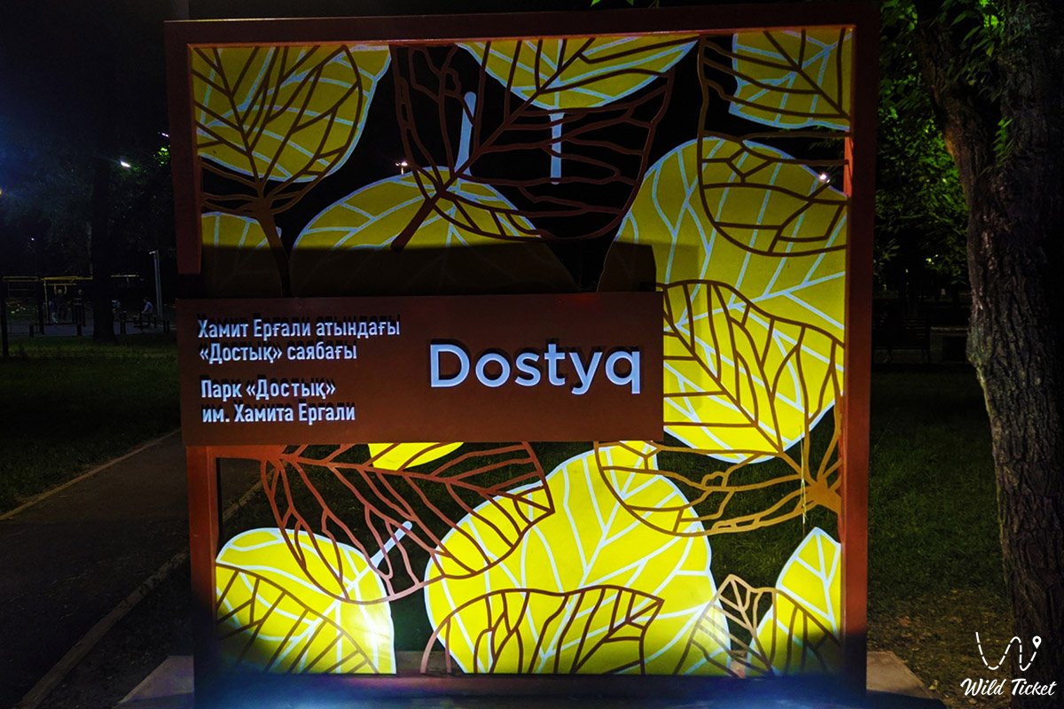 Dostyk Park named after Hamit Ergali is located on Temirezeva Street, corner of Shashkina Street, next to the Yessentau River and Al-Farabi University, Bostandyk district, Almaty, Republic of Kazakhstan.