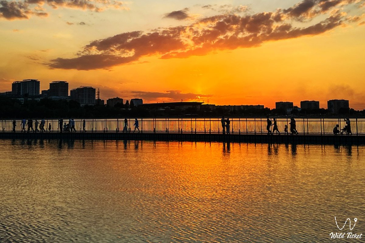 Special attention is drawn to the pontoon bridge connecting the two embankments. Walking along it creates the effect of walking right on the surface of the water – this is one of Sayran most unusual experiences.