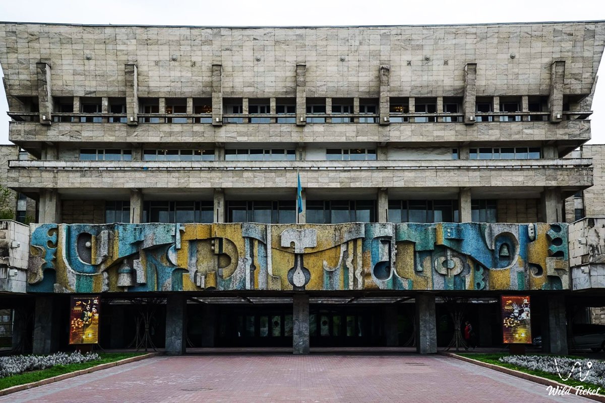 阿拉木图Natalia Sats剧院的建筑反映了当时的精神 - 苏联古典主义与柔和的新艺术运动元素的结合, 营造出庄严和舒适的感觉。 该建筑由浅色石头建造, 装饰有灰泥和装饰板, 描绘戏剧面具和花卉图案。