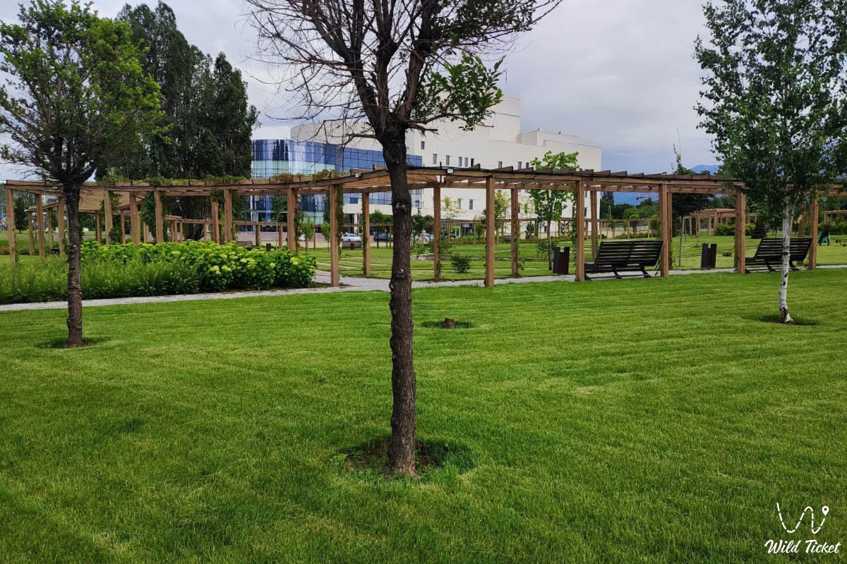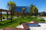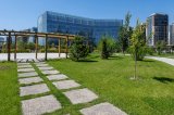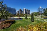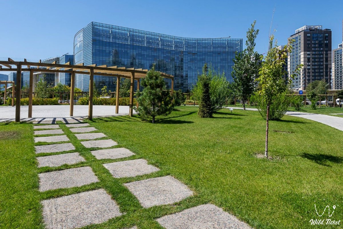 Halyk广场小巷以现代城市风格装饰: 光滑的几何路径, 宽阔的步行区域, 整齐的一排排树木和低矮的观赏灌木。 沿着小巷的灯在晚上创造了柔和的照明, 白天的空间充满了平静的日光从周围建筑物的玻璃外墙反射。