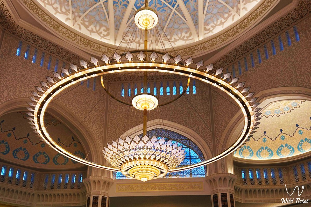 清真寺的内部充满了纪录。大厅装饰着一盏重20吨、直径27米的水平水晶吊灯,由130多万个碎片组成。地面铺着一块15525平方米的手织地毯,在新西兰用100%纯羊毛制成。这块地毯被认为是世界上最大的地毯,装饰着复杂的哈萨克图案。清真寺的墙壁在蓝色背景上装饰着阿拉伯书法和色彩鲜艳的雕刻。
