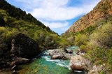 Aksu峡谷是大自然的宏伟创造和奇迹, 数百万年来, 水和风在岩石上雕刻出深深的裂痕, 陡峭的墙壁高达500米。 Aksu河, 其名字翻译为 "白水", 在峡谷底部沸腾, 与红色的岩石形成惊人的对比。 这个地方的规模令人惊讶 - 峡谷相当长, 超过35公里, 在最狭窄的地方, 墙壁之间的距离不超过650米。 Aksu峡谷和Aksu河是Aksu-Zhabagly州立自然保护区的一部分, 位于Talas Alatau山脉海拔900至1500米的高度。 这个保护区是中亚最古老的保护区-它成立于1926年。 这片领土不仅因其景观而独特, 而且因其丰富的动植物而独特。 在岩石壁龛中, 您可以看到稀有鸟类的巢穴, 包括黑鹳和胡须秃鹫, 如果您在峡谷的上游幸运的话 - 您可以注意到雪豹或雪豹本身的踪迹。 春天, 峡谷的山坡上复盖着Greig郁金香和其他地方性和稀有植物的地毯。 阿克苏峡谷之旅从附近的Zhabagly村开始。
