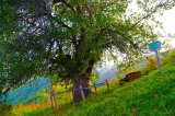 До перевала, на протяжении 5 километров мы едем среди яблоневого леса, здесь иногда встречаются деревья боярышника, абрикоса. Яблоневые леса в ущелье представлены массивами различного размера, небольшими группами и отдельными деревьями на всем протяжении дороги.