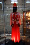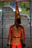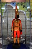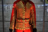 Наиболее впечатляющим элементом наряда «Золотого Воина» стал высокий головной убор-шлем, устремлённый к небу. Его высота достигала 70 сантиметров, а декор состоял из золотых пластин в виде рогов, крыльев и стрел, что символизировало власть и небесное происхождение правителя. Шлем подчёркивал статус воина как сакрального защитника земли и посредника между людьми и небесами. При археолгических раскопках были обнаружены не только украшения, но и оружие: короткий меч-акынак, кинжал, стрелы. Это подтверждает, что покоящийся здесь был воином, возможно – наследником сакского престола. Находка серебряной чаши с надписью, выполненной на одном из древних алфавитов, до сих пор вызывает жаркие споры среди учёных: одни считают её прототюркской, другие – ираноязычной. Эта надпись остаётся загадкой, словно зашифрованное послание из глубины веков.