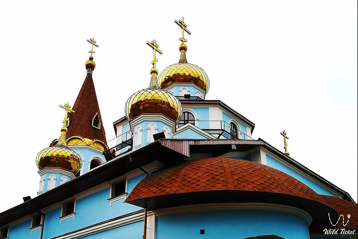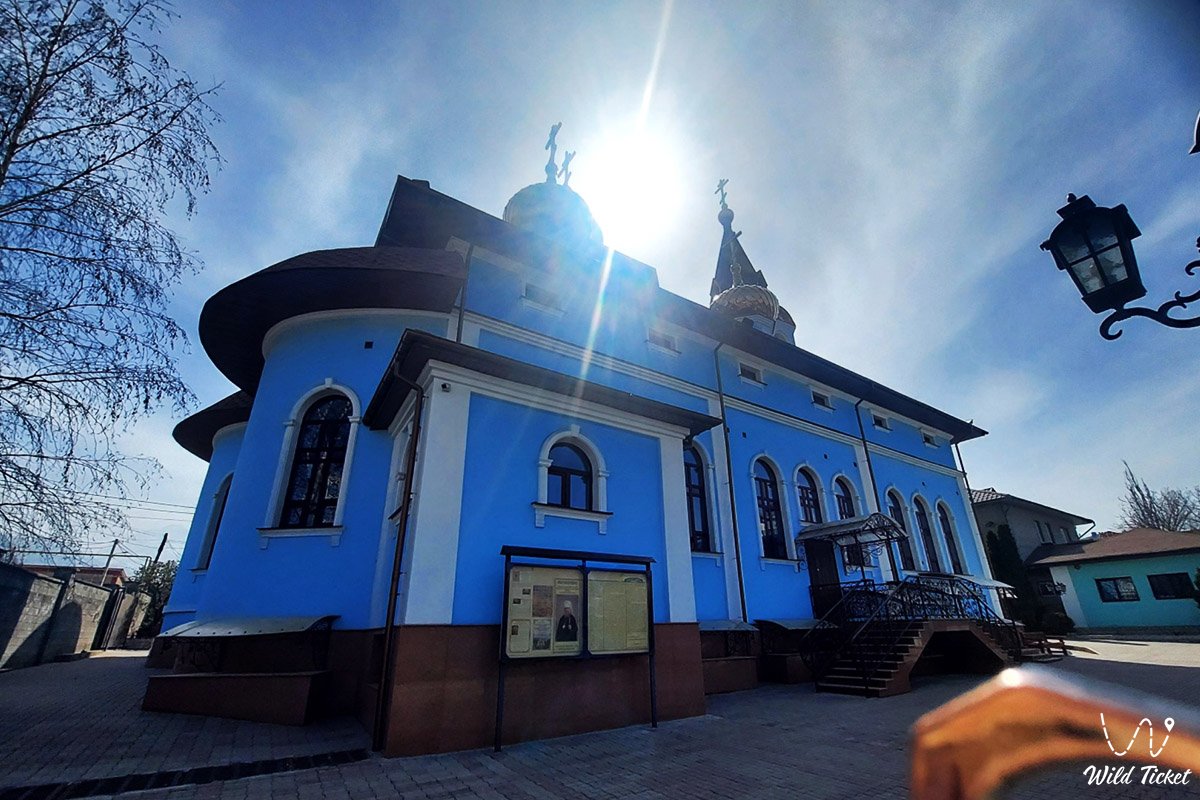 Сегодня храм сияет небесно-голубыми фасадами, белыми колоннами и золотыми куполами, став одним из самых красивых православных зданий Алматы.