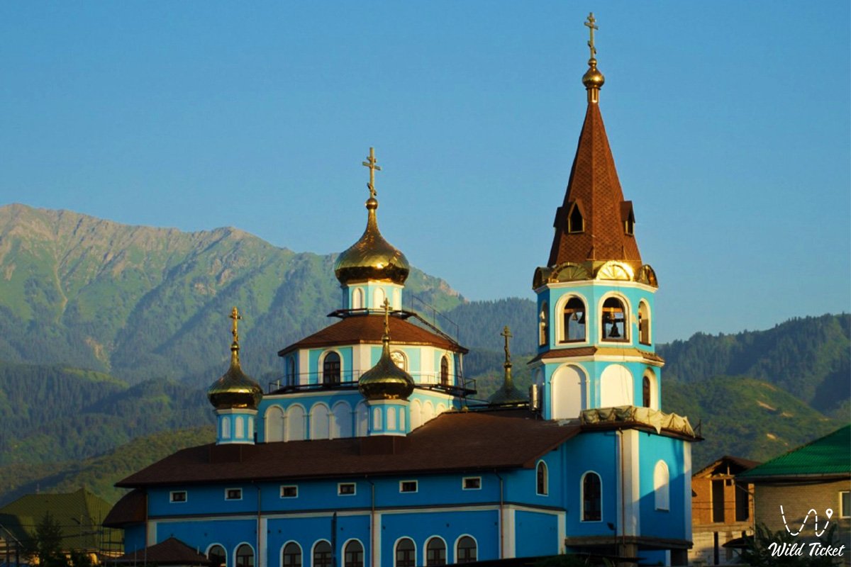 Небесно-голубые стены символизируют чистоту и духовность, а золотые купола отражают солнечный свет, напоминая о Божественной благодати. Вход украшают резные двери с изображениями апостолов и святых, выполненные казахстанскими мастерами.