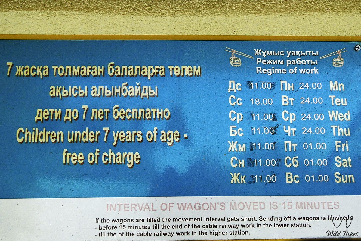 Стоимость подъема: Проезд в один конец – 3500 тенге. Проезд в оба конца – 6000 тенге.