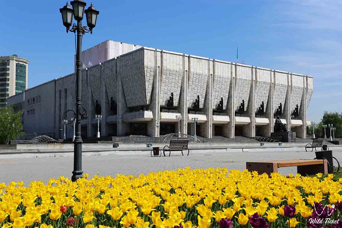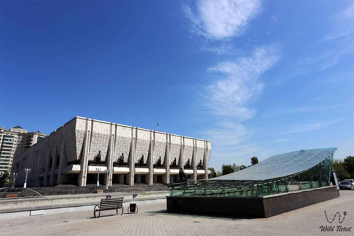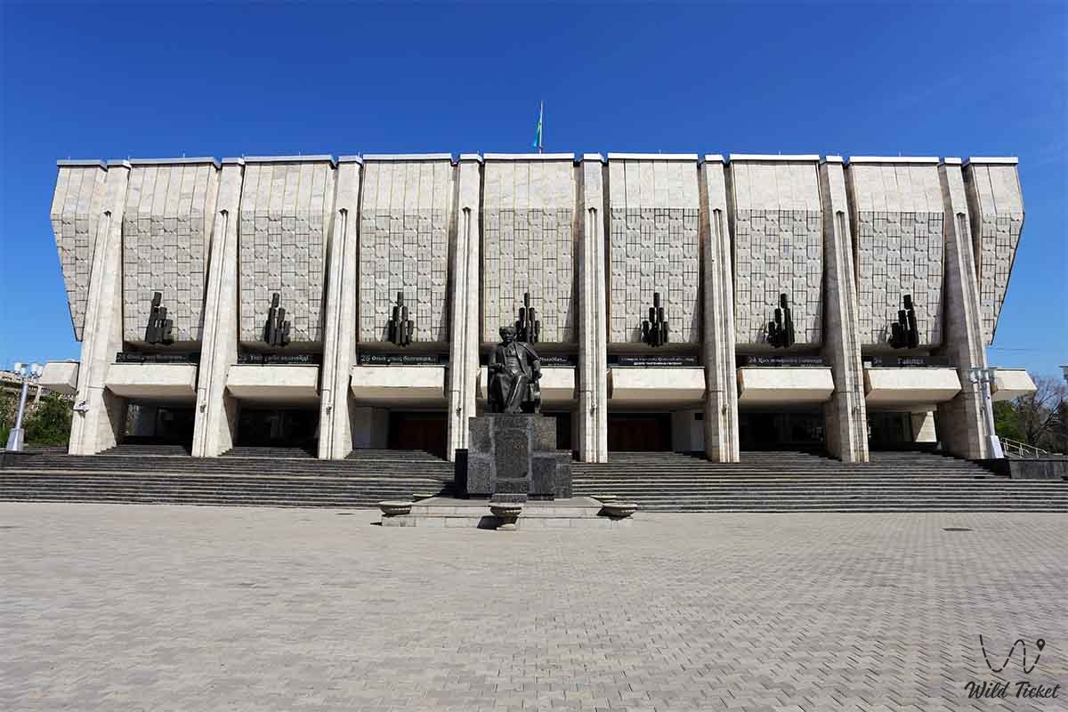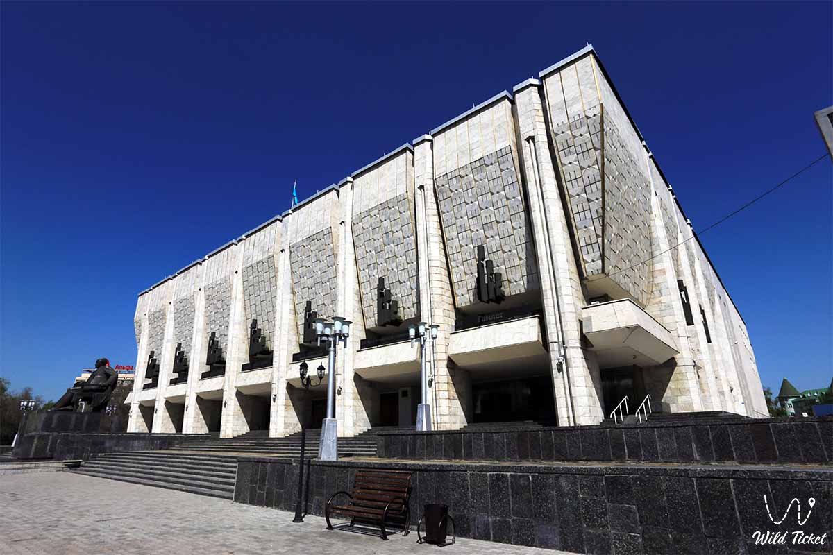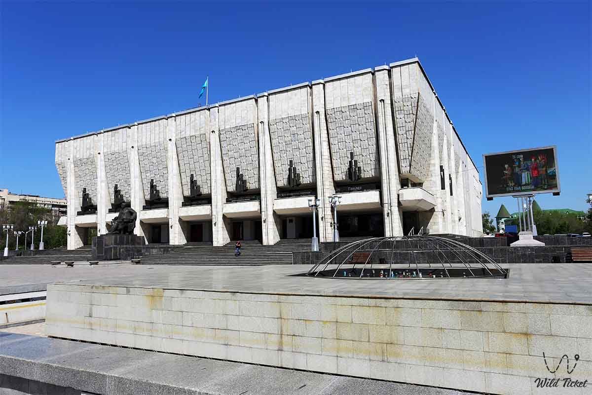 Современное здание театра, завершённое в 1970-х годах, стало одной из архитектурных доминант Алматы. Оно создано в стиле монументального модернизма и украшено национальными мотивами, подчёркивающими культурную самобытность. Пространство внутри – просторное, светлое, торжественное – идеально подходит для крупных постановок и масштабных сценических решений.