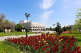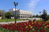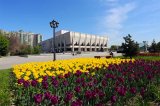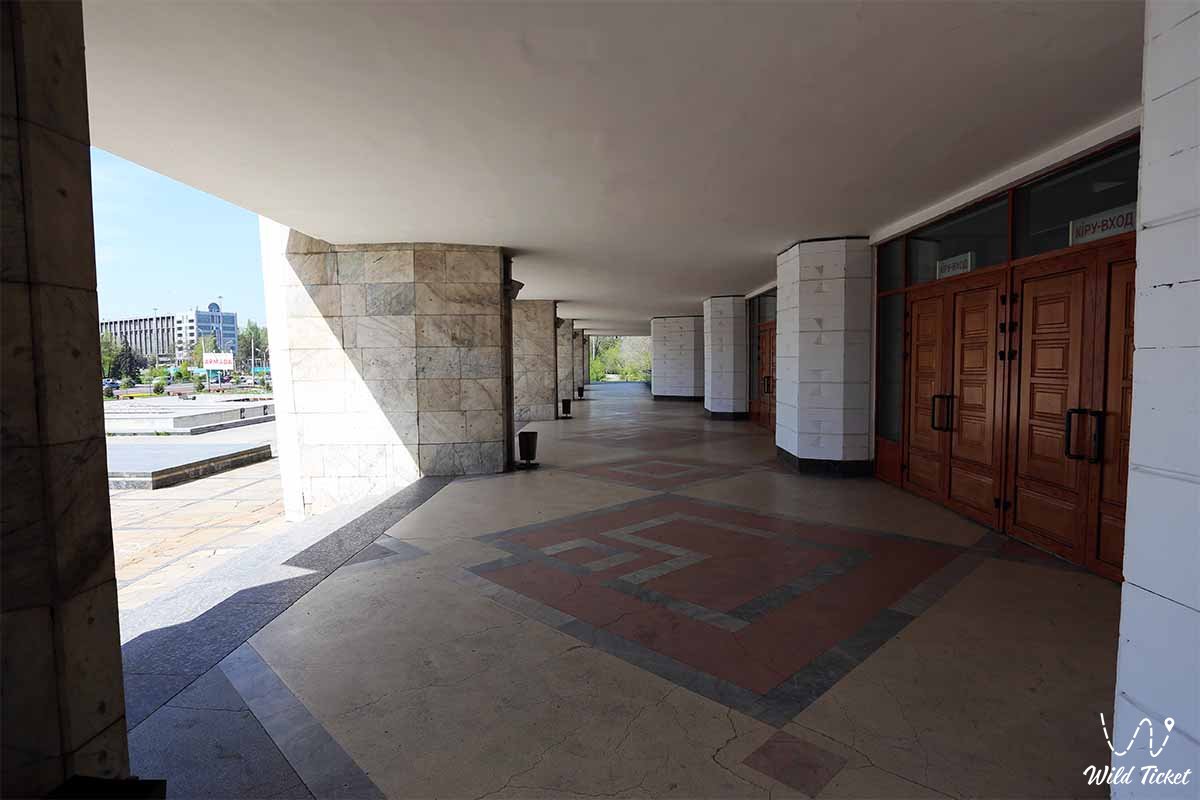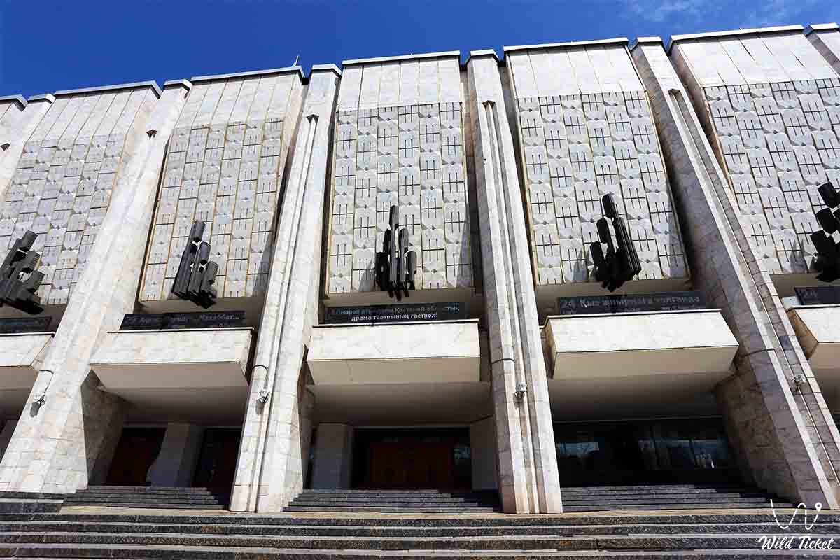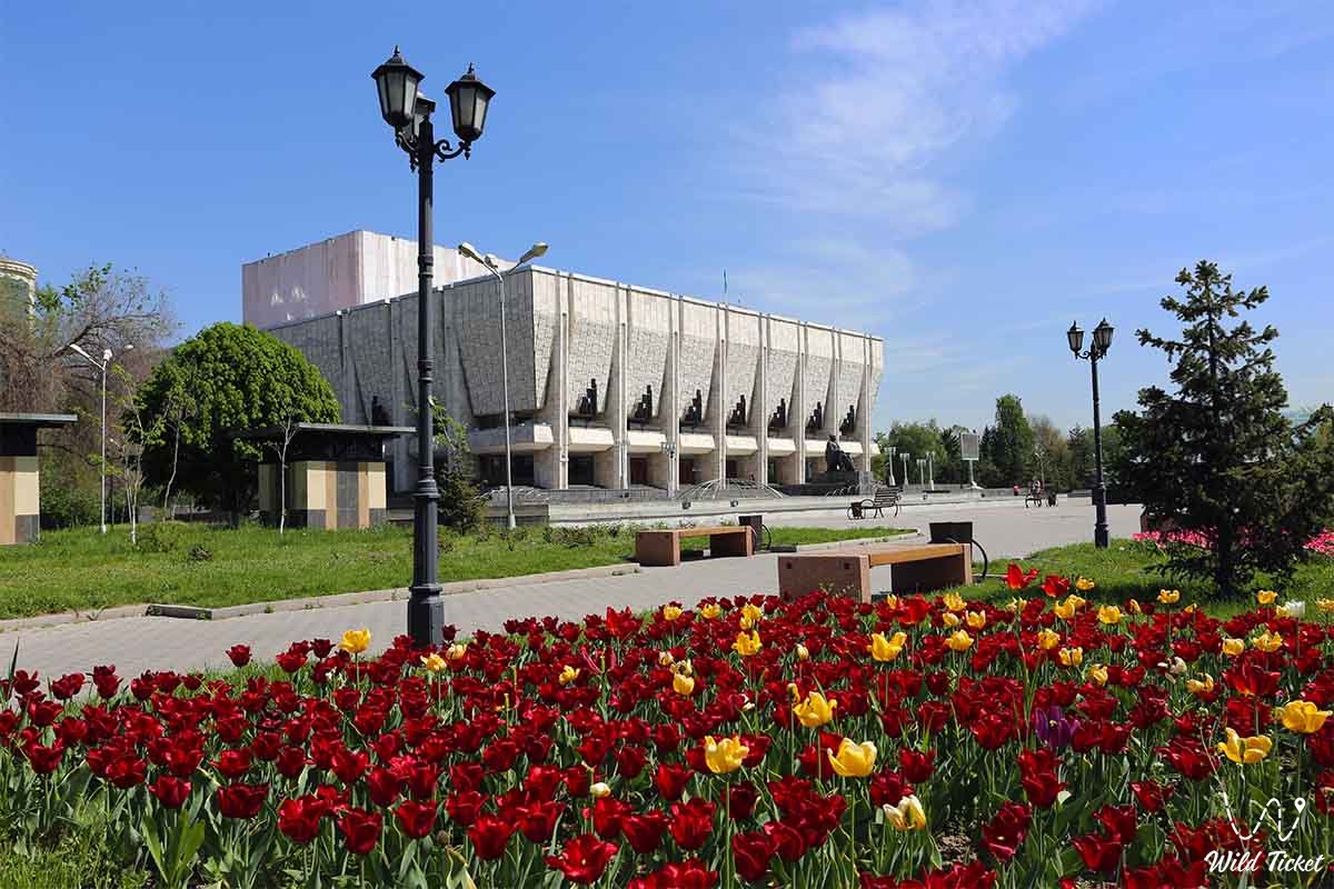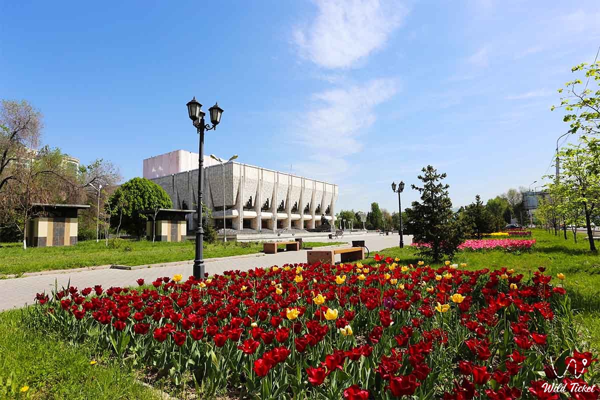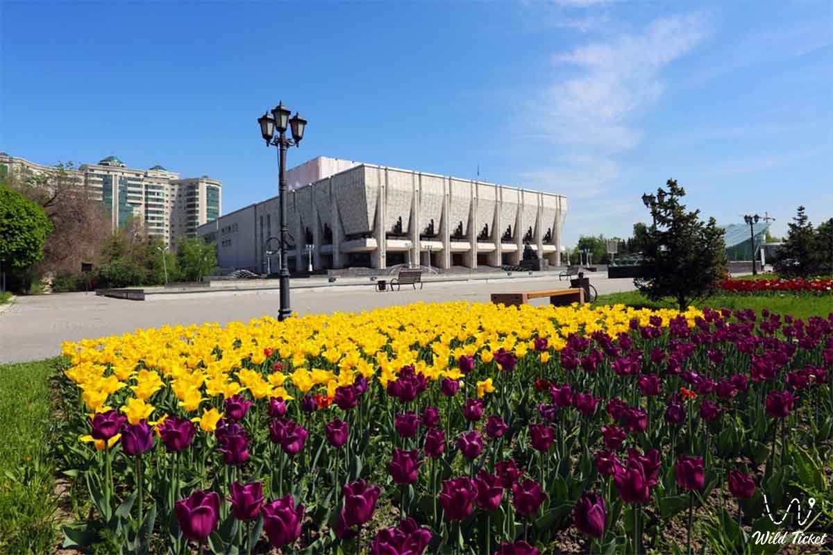 С площади перед театром открывается красивейшая горная панорама Заилийского Алатау. Так же напротив театра через улицу находиться Алматинский цирк.